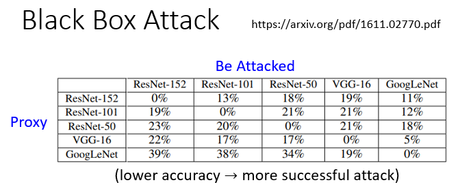 當找一個 attacked image 可以成功騙過多個 network,要騙過一個不知道參數的 black network 也非常容易成功