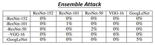 column 代表要被攻擊的 network,每一個 row 是 5 個模型都集合起來,但拿掉對應的模型,對角線屬於黑箱攻擊,使用除了該行以外的其他四種模型聚合得到的模型進行攻擊