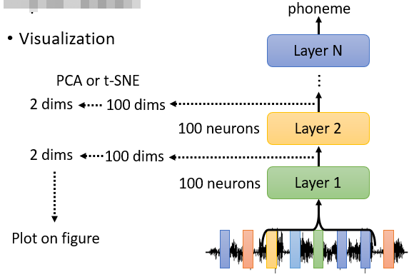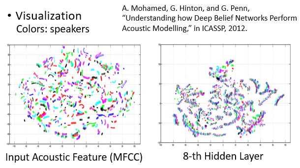 對於語音識別問題,取出模型 hidden layer 中的向量作降維可視化。每種顏色代表一個 speaker,可以看到每一個條帶有不同顏色的向量,說明不同 speaker 說類似的話會被聚攏到空間中的接近位置