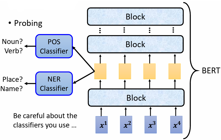 訓練 classifier,利用模型中的某些層的輸出向量進行一些分類任務,如 POS、NER,正確率高,說明 embedding 有相關信息,反之則無