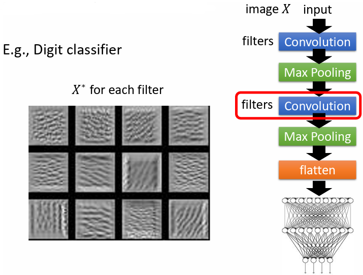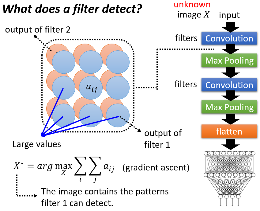 要模型針對每一個 filter 找出一個 ,將它輸入進已經 train 好的 CNN convolutional layer,可以使針對該 filter 輸出的 feature map 中的值越大,說明此 滿足該 filter 想要偵測的 pattern 的部分越多,由此可以將此 filter 所偵測的 patterns 可視化