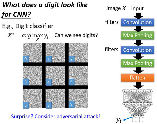 實驗結果卻是一堆雜訊,沒有辦法看到確切的數字。間接說明了 adversial attack 中,只需要一些雜訊就能攻擊成功讓模型誤判