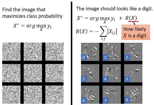 針對上述方法的 optimization problem 加上一個限制 ,不只希望輸出的某一類別分數 要最高,還要考慮 多像一個數字,產生的結果可能會好一點