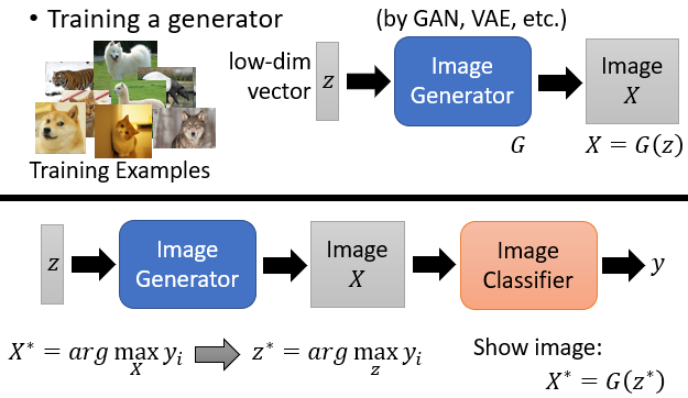 將 image generator 跟 Image classifier 接在一起,image generator 的輸入 是從高斯分布採樣得來,輸出是圖片 ,image classifier 以 作為輸入,然後輸出分類的結果 ,期望 對應的某一個類別的分數越大越好
