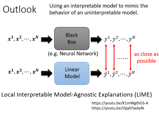 用線性模型來模仿一個黑盒子模型。由於 linear model 能力有限,不可能模仿整個 neural network 的行為,但可以讓它模仿 neural network 一小個區域的行為,以此解讀那一小個區域裡面發生的事情