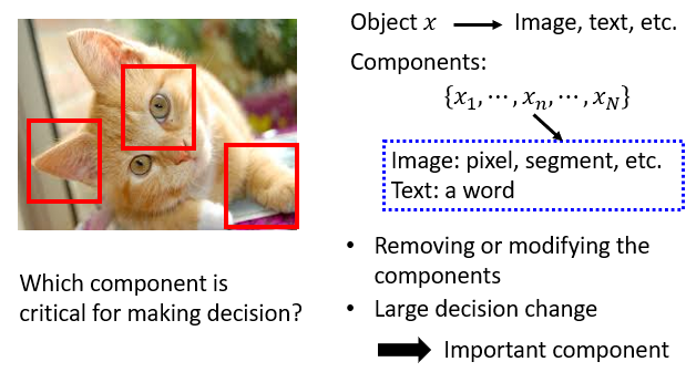 component 可以是圖片的像素、文章的詞匯等等,對每一個 component 做變化、或刪除,如果 network 的輸出有了巨大的變化,就表示該 component 很重要