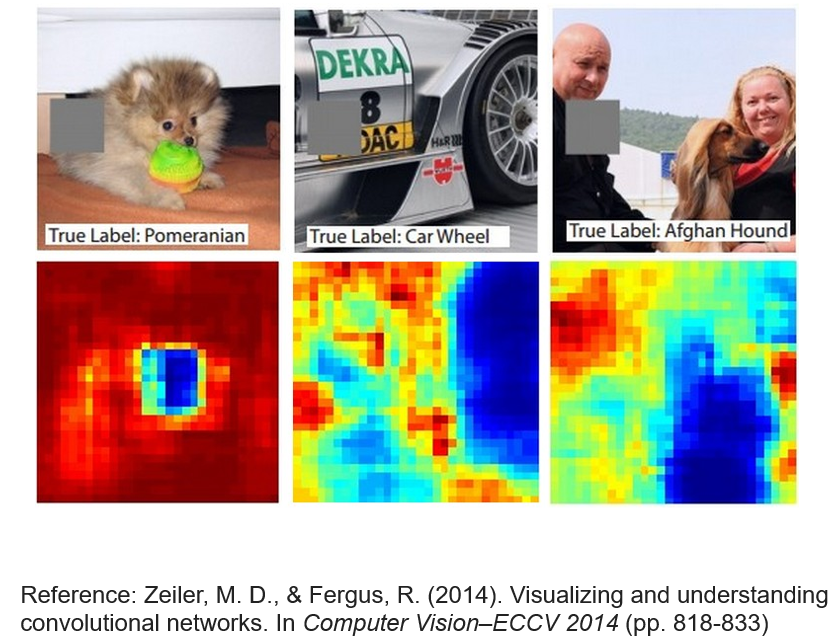 灰色方塊放在紅色區域對輸出結果影響較小,輸出原類別的機率高;但放在藍色區域對輸出結果影響較大,輸出原類別的機率低