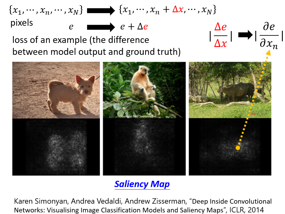 每一個 代表一個 pixel, 是模型輸出的結果跟正確答案的 cross entropy。要考察某一個像素的重要性,可將該像素改變 ,此時 也會發生改變