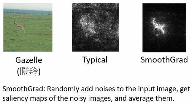 在某一圖片上面加上各種不同的雜訊,得到各種不同的圖片後,對每一張圖片計算 Saliency Map,平均起來得到 SmoothGrad 的結果,如結果往往能夠更加集中在被偵測的物體上