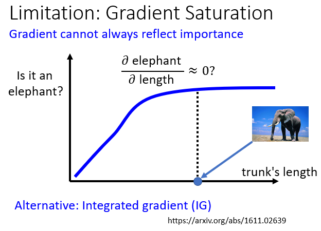 所以光看 gradient 得到的 Saliency Map 就會有錯誤的結論:鼻子的長度,對是不是大象這件事情是不重要的