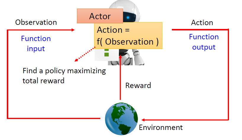 actor 就是 RL 中要找的 function,輸入為 observation,輸出為 action,function 的目標是最大化從 environment 獲得的 reward 總和