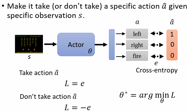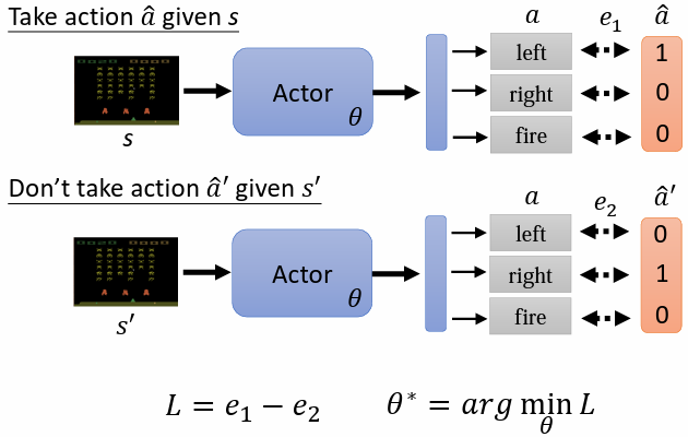 - 若希望 actor 在看到某個 時採取某一 action,只需將其看做一般的分類問題即可,為其設定 ground truth ,loss 採用 cross-entropy