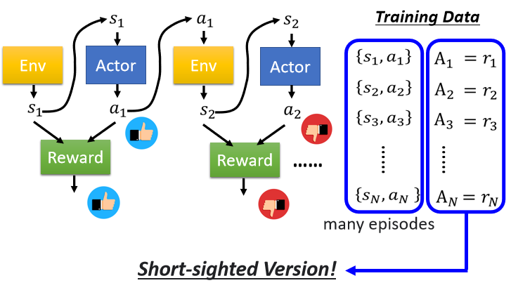 - 利用定義的 reward function 進行訓練,更新 actor 的參數,使 actor 能夠最大化 reward