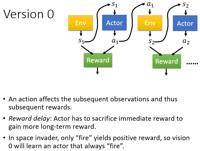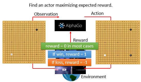 actor 以 environment 提供的 observation 作為輸入,而 actor 收到 observation 後,會輸出 action 影響 environment,environment 受到 action 的影響產生新的 observation,environment 會不斷地給 actor 一些 reward,告訴他採取的 action 好不好