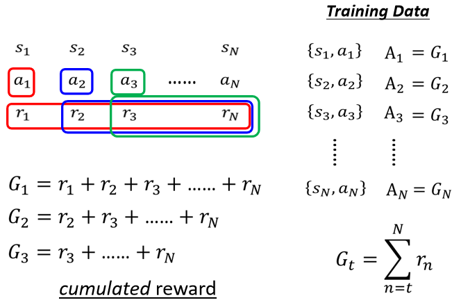 Version 1 中, 有多好,不僅取決於 ,也取決於 之後所有的 reward,也就是把 當下及之後的所有 action 得到的 reward 通通加起來,得到 (cumulated reward)