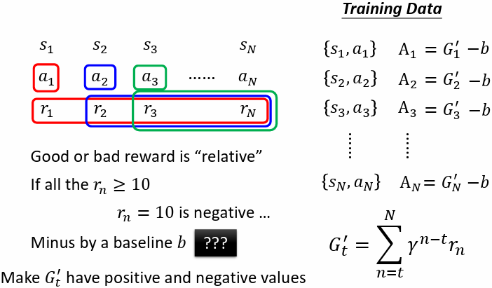 假設某一遊戲得到的 reward 永遠都是正的,只是有大有小不同,因此每個 都會是正的,就算某些行為是不好的,還是會鼓勵機器採取某些行為,所以需要做標準化,改良 Version 2,把所有 減一個 baseline
