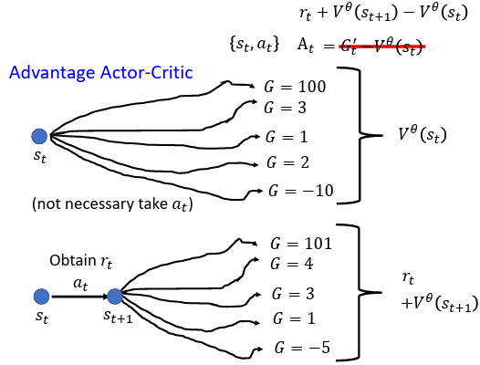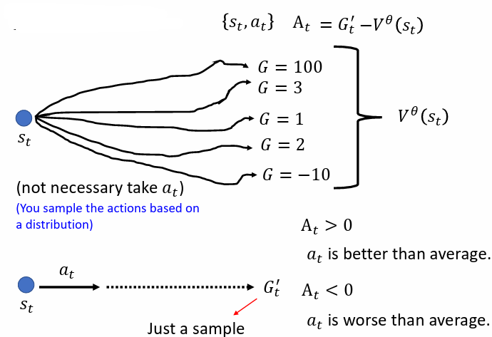 - 若 ,表示 ,意義為採取特定 action 得到的 比隨機選擇一個 action 的期望值 不好,所以給予負的評價