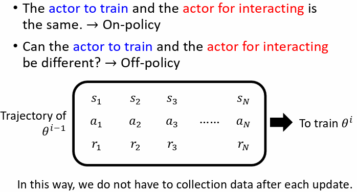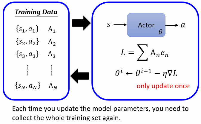 每次更新完一次參數以後,資料就要重新再收集一次,此舉非常花時間。而這麼做的目的是因為帶 參數的 actor 收集到的資料,不一定適合拿來做為更新 的資料