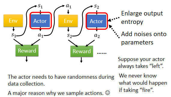 期望跟環境互動的 actor 採取 actions 的隨機性要夠大,如此才能收集到比較豐富的資料
