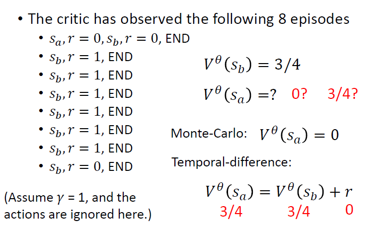 由於 MC 與 TD 的背後的假設不同,訓練得到的 critic 也不同