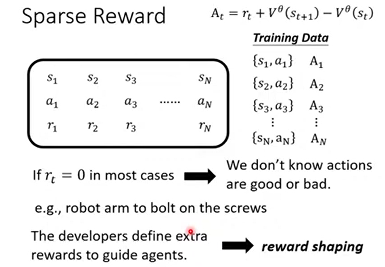 Sparse Reward 就是 reward 大多數情況都是 0,只有在少數情況是一個非常大的數值。意味著很多 actions 無從判斷是好是壞。例如圍棋到遊戲結束才會有 reward,過程中都沒有 reward