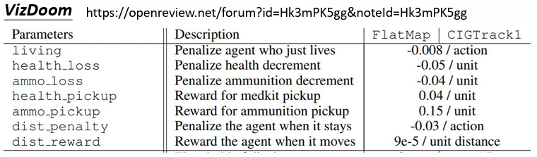 如射擊類遊戲,除贏得勝利得到 +reward 及輸掉遊戲得到 - reward 外,額外定義了其他行為可以得到正的或負的 reward,如撿到補血包(+)、待在原地(+)、存活(-)等等