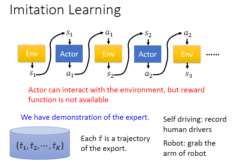引入 expert(通常為人類)的示範。找很多 experts 跟環境互動,記錄互動的結果 ,每個 代表一個 trajectory