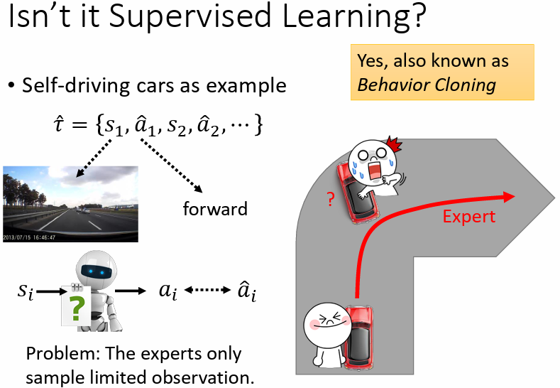 類似於監督式學習,讓機器做出的 action 跟 export 做出的 action 越接近越好,又稱作 Behavior Cloning