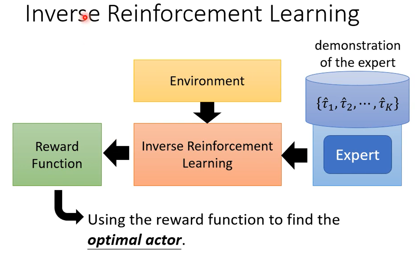 從 expert 的 demonstration,還有 environment 去反推 reward funtion,學出一個 reward funtion 後,再用一般的 RL 來訓練 actor