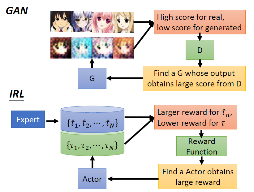 IRL 就如同 GAN,actor 可視為 generator;reward function 可視為 discriminator