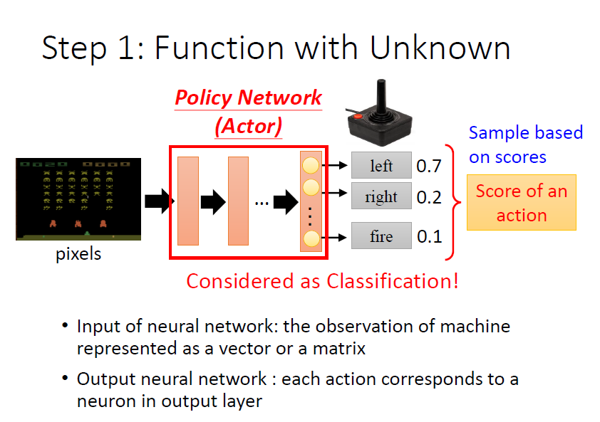 - 輸出:每個可採取行為的分數(向左 0.7 分、向右 0.2 分、開火 0.1 分,相加為 1)