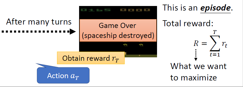 一整局遊戲稱為一個 episode,遊戲中每個行為都可能得到 reward,把所有的 reward 相加得到整場遊戲的 total reward,又稱為 return