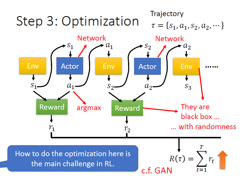 總之,還是可以把 RL 看成三個階段,只是在 optimization 時,如何最小化 loss(最大化 return)跟之前學到的方法是不太一樣的