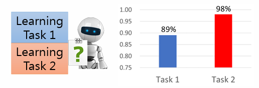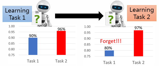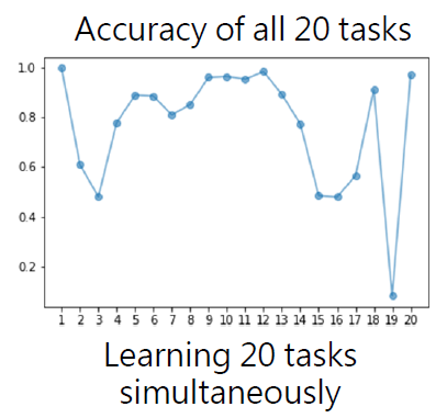 • 先後利用兩個任務的資料進行訓練,以 task 2 的資料訓練模型後,機器在 task 1 的表現下降許多