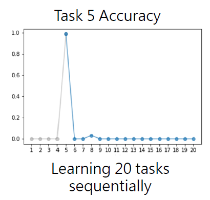 • 依序學 20 個任務,學到 task 5 時的準確率提升,但自 task 6 後準確率暴跌